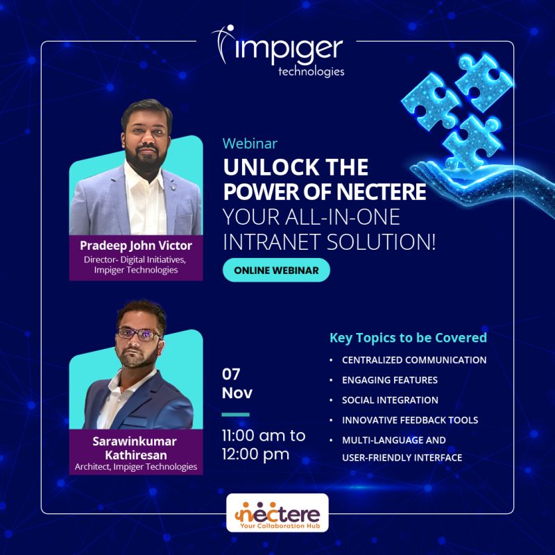 Chennai, November 5, 2024 – Impiger Technologies successfully conducted an exclusive webinar on Nectere, its feature-rich intranet solution designed to streamline internal communication, enhance operational efficiency, and drive digital transformation across organizations.